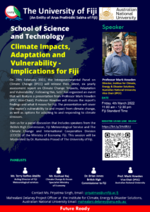 The Intergovernmental Panel on Climate Change (IPCC) will release their latest, six yearly assessment report this week. Following this, the School of Science and Technology would like to invite you to an online seminar on Climate Change Impacts, Adaptation and Vulnerability. The seminar will take place on the 4th of March. This event will feature a presentation from Professor Mark Howden (IPCC Vice-Chair and Director, Institute for Climate,Energy & Disaster Solutions, Australian National University). The seminar will also include a panel discussion with speakers from the British High Commission, Fiji Meteorological Service and The Climate Change and International Cooperation Division (CCICD) of the Ministry of Economy, Fiji.