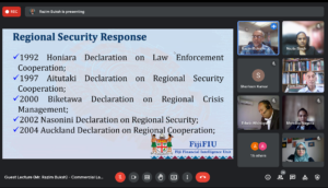 Mr. Razim Buksh, Director of the Fiji Financial Intelligence Unit (FIU), delivered a special virtual lecture to over 40 Graduate Diploma in Legal Practice (GDLP) and Commercial Law students on October 7, 2021.
